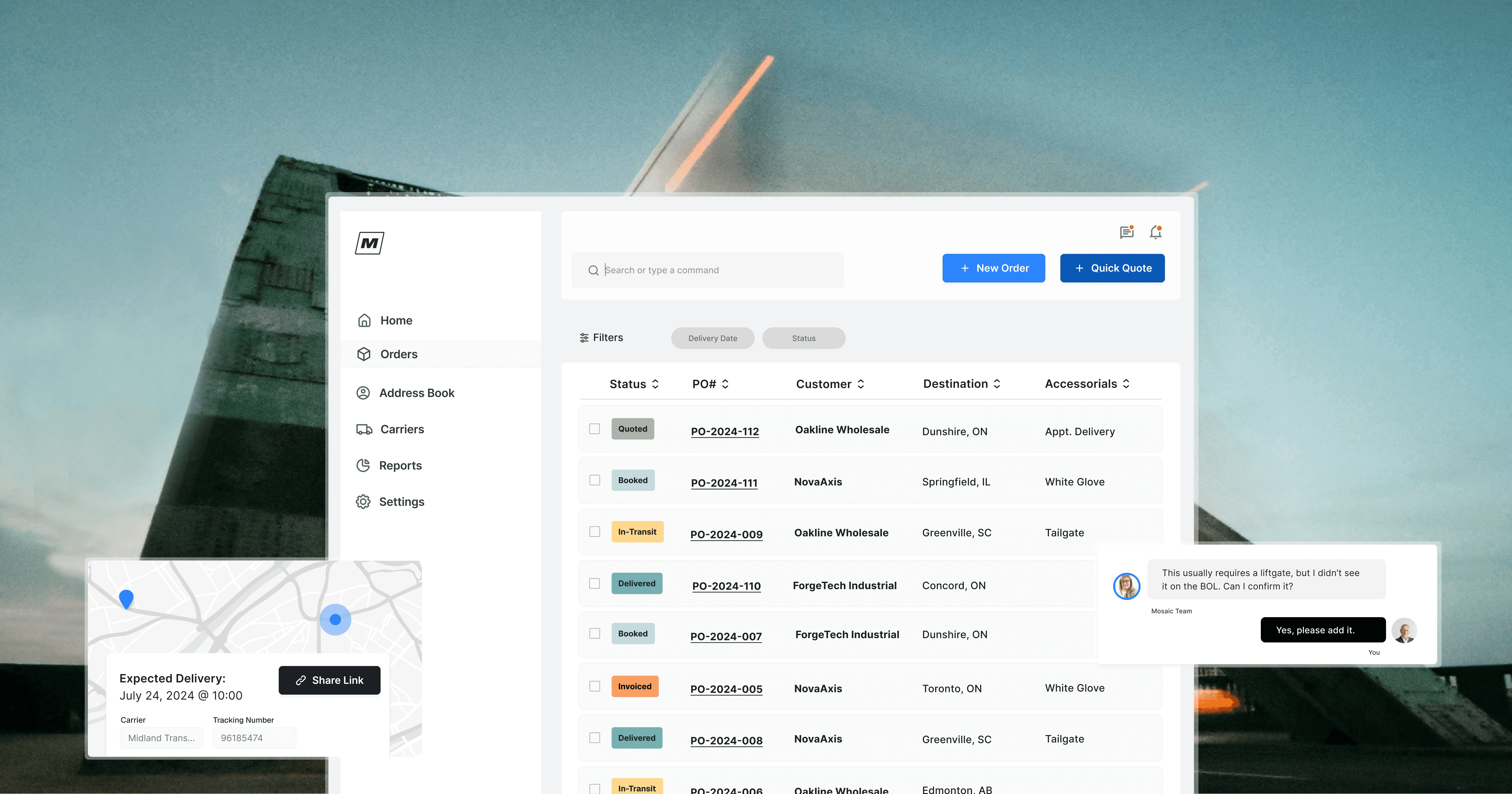 Live carrier location to see where shipments are, plus tracking links that keep customers updated on ETAs before they ask.